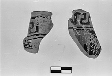 | Description: | Two non-joining oinochoe (olpe?) fragments. a) Rim with key pattern right. b) Key pattern right, indistinct scene. Attic. | |