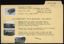| Description: | Medium foot, at least one ring inside. Horizontal lug handle, grooved. On the keeled rim, three grooves around the top, and one around the bottom. About half the pot is preserved, and a fragment of the foot, which does not join. On rim, in white paint, a running dog pattern. Orange clay; red matte paint inside and part way below rim outside; burned black on rim. Late Roman D. | |