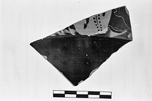 Description:   Fragment preserves lower portion of horse to left, one hoof raised, and woman right facing horse (drapery and white feet). Incision on drapery.