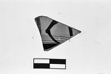| Description: | Fragment from wall of cup. Legs of male figure. Four lines, black. Interior good black glaze. Attic. ADDENDA Perhaps a satyr. This would explain the red object on the left. | |