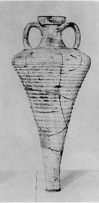 | Description: | Broad, nearly flat shoulder. The pinched in body tapers to a plain straight foot. Horizontal ribbing on body below shoulder. Outside heavily coated with white slip or paint. Coarse red clay with many impurities. Unglazed. | |