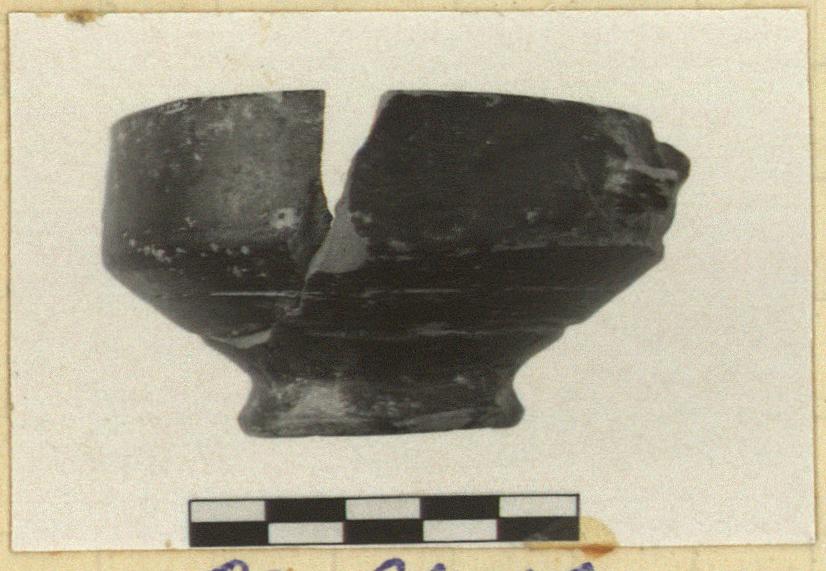 | Description: | Half preserved. Handles missing. Ring foot with reserved resting surface. Upper body angled in. Angular profile. Groove on lower body. Orange clay; metallic brownish-black glaze. | |