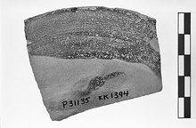 | Description: | Fragment of rolled rim. Straight wall. Reddish-orange clay. Peeling, metallic gray-black glaze on inside and on upper part of outside. | |
