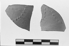 a) Lower wall and part of flat bottom. Wall decorated by festoons of applied dots.