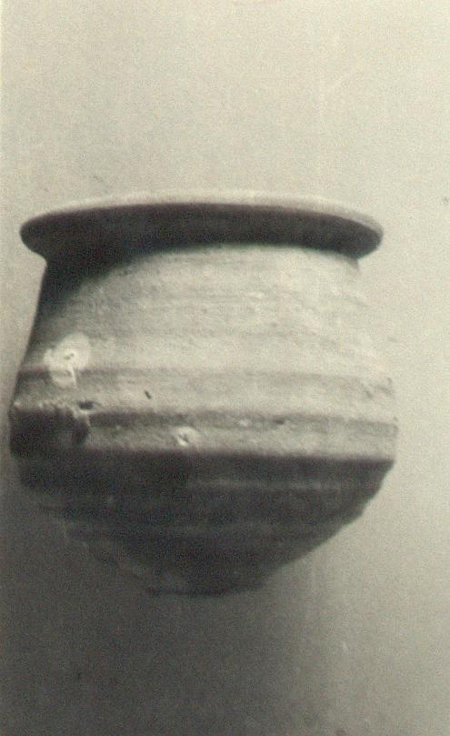 | Description: | [Deep cup.] Low irregular foot; small flaring rim; handleless. Body horizontally ribbed. Coarse red and black clay; unglazed. | |