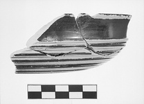 | Description: | a Rim, wall and part of bottom. b) Lower wall and omphalos. Concave rim. Shallow body horizontally ribbed on outside. Omphalos surrounded by reserved ridge on interior. Lowest part of exterior wall plain with omphalos surrounded by reserved band and ridge. Inside entirely glazed shiny black, except for reserved ridge around omphalos. On outside, rim and alternate grooves of body glazed. Black glaze on upper body, red on lower body. | |