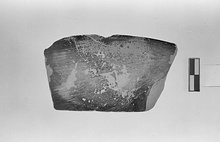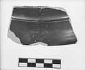 | Description: | Fragment of rim. Rim plain on exterior, offset on inside. Shiny black glaze inside, mottled red and black outside. Delicate class. | |