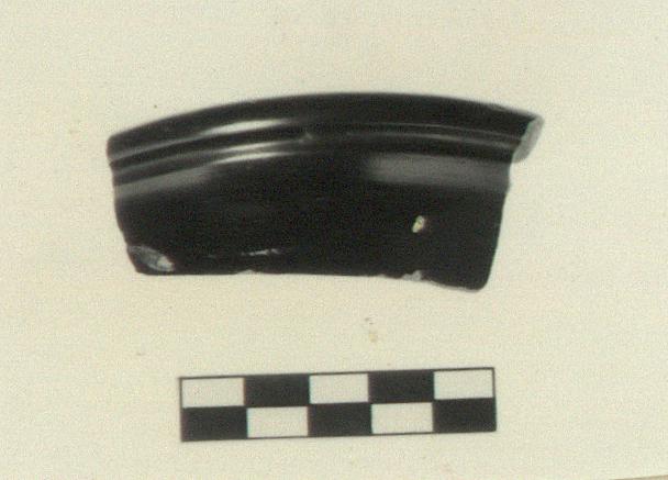 | Description: | Fragment of rim. Slightly incurved rim, thickened to outside with slight groove below. Black glaze. | |