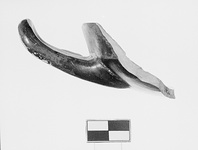 | Description: | Single fragment broken all around, preserving part of rim and handle. Straight rim, offset on inside and outside. Handle attached below rim rises above rim. Handle panel and inside of handle reserved and miltosed. Shiny black glaze. Dull green to red on exterior rim. | |
