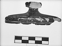 Description:   Three-quarters of edge of lid missing. Vertical, downturned, reserved on bottom with groove on outer edge. Edge of top offset. Molded knob, convex on side with molding at bottom, concave on top.