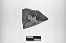| Description: | A single fragment from an open vessel preserves part of the body. The head of woman and part of her shoulder remain. She wears chiton, mantle and an earring. | |