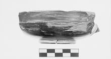 | Description: | Complete profile, with base, most of lower wall, one-third of rim and base of one handle preserved. Low ring foot with reserved resting surface. Reserved, miltosed underside with three concentric glazed circles and central dot. Rim out-turned and offset from body. Handle attached below rim. Dull brown to red glaze. Cf. Agora XII, no. 456 (480-470 B.C.). | |