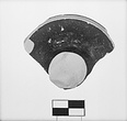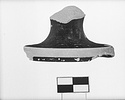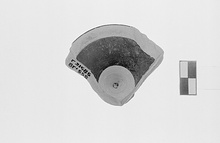 | Description: | Ca. one-fourth of foot and lower stem preserved. Flaring ring foot with concave side, with torus moulding on bottom. Curved resting surface. Resting surface reserved and miltosed. Outer face of foot, except for torus moulding, reserved and miltosed. Center of underside reserved. Shiny black glaze. Cf. Agora XII, no. 437 (Vicup: ca. 460 B.C.). | |