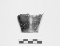 Description:   Lower body preserved. Flat bottom, slightly concave underneath. Steep wall, slightly concave at base; footless. Dull black glaze. Unglazed inside.