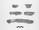 | Description: | Four non-joining fragments of rim. Overhanging rim, flat on top, with concave overhang. On top, linked lotus motif. On side, two rows of dots bordered by lines. Shiny black glaze. Reserved surfaces miltosed. ADDENDA Another fragment of same krater found in lot ΒΓ 1, fill of the Royal Stoa. Cf. I 4-5: 1. | |