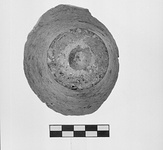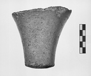 | Description: | Toe. Tapering toe, slightly convex underneath with small central depression. Fine gray clay with abundant mica, coarse white inclusions, large irregular voids. Lighter surface (10YR 5/1 gray). | |