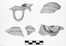 | Description: | Six fragments. Two join to make P 31693. The others are non-joining. a) Preserves horizontal ribbon handle with part of curved wall. b), c), d) From upper wall and edge of mouth. e) Flat base decorated with concentric rings of glaze inside and out. Decoration on shoulder of four narrow bands, the outer ones red, the inner ones brown. Above this, row of dots, and two more bands, in brown glaze. At least one narrow glazed band below handle. Fine, hard clay with no mica. Very pale brown (10YR 8/3). | |