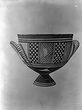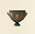 | Description: | Most of one handle, and considerable portions of the body missing. On either side, four vertical panels with, alternately, checkerboard pattern and lines crossing diagonally. Short black stripes on rising handles. Reserved beneath the handles. Three reserved bands beneath the patterns. Low conical foot with two reserved bands. Light buff clay; black glaze. | |