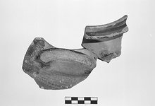 | Description: | Two joining fragments preserving rim and handle. Fragment of a deep lidded lekanis. Rim has flange for lid. Loop handles, slightly upturned, round in section. Thin glaze on rim, flange, handle and body below handles. Dark orange-red clay with white inclusions. Cf. Agora XXXIII, no. 160. | |