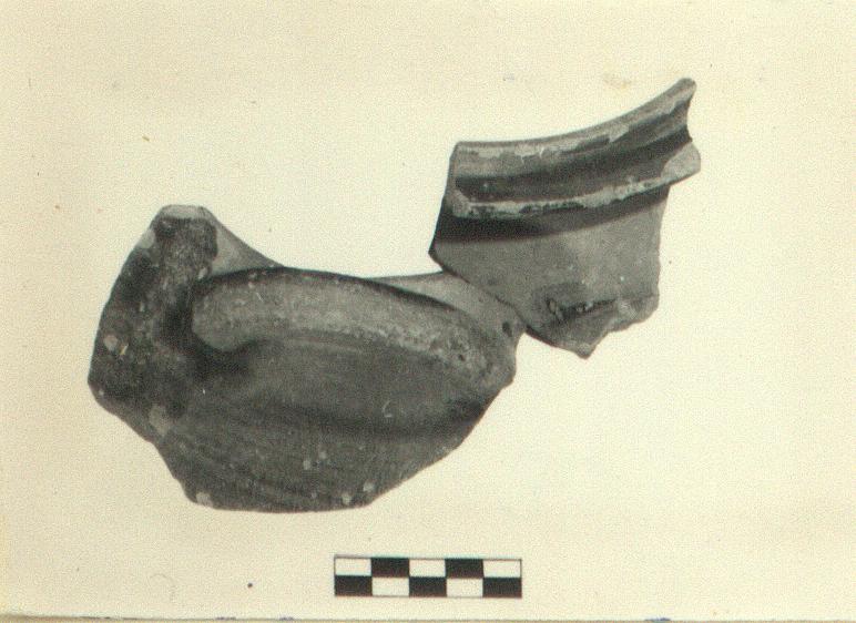 | Description: | Two joining fragments preserving rim and handle. Fragment of a deep lidded lekanis. Rim has flange for lid. Loop handles, slightly upturned, round in section. Thin glaze on rim, flange, handle and body below handles. Dark orange-red clay with white inclusions. Cf. Agora XXXIII, no. 160. | |