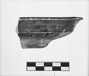 | Description: | Ca. one-quarter of rim, small segment of wall and foot: not complete profile, lacking center of floor. Ring foot with flat resting surface. Angular wall. Flaring, out-turned rim. Slightly metallic red to black glaze, peeling on outside. | |
