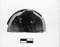Description:   Half of foot. Moulded base with flat, reserved resting surface. Underside reserved with two broad glazed bands. On floor, linked palmettes (three preserved) around incised circle.