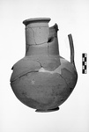 | Description: | Lacking much of foot, ca. one-half of body and rim. Nearly complete profile. Ring foot with flat resting surface. Ovoid body, with sloping shoulder. Tall, cylindrical neck. Thickened rim, flaring outwards, rounded on top. Strap handle attaches at shoulder and at light handle ridge below rim. Orange-buff fabric with small white and micaceous inclusions. Thin fabric. Unglazed. Cf. Hesperia 43 (1974) (Menon's cistern), no. 46; Hesperia 3 (1934), nos. A 53-55; B 39, similar but with flat bases. | |