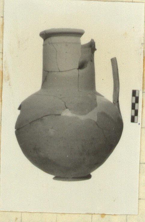 Description:   Lacking much of foot, ca. one-half of body and rim. Nearly complete profile. Ring foot with flat resting surface. Ovoid body, with sloping shoulder. Tall, cylindrical neck. Thickened rim, flaring outwards, rounded on top. Strap handle attaches at shoulder and at light handle ridge below rim.