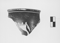 | Description: | Fragment of neck and rim. Out-turned rim with scraped groove below on outside. Double cornucopia with white body, fillets hanging from either side, and three sprouts above. To right, trace of bunch of grapes with tendrils, leaf, and white dot rosette. Metallic black glaze. | |