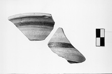 Decorated with alternating bands in white and in brown glaze, both inside and outside. Fairly hard, micaceous clay with very small black and red inclusions and voids. Reddish-yellow clay, 5YR 7/6.