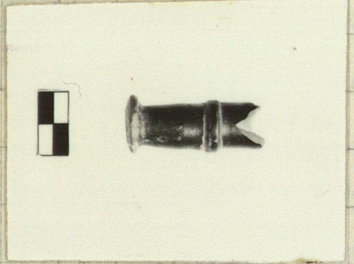 | Description: | Broken at bottom. Tubular spout with very small opening. Projecting rim; raised ring with scraped groove on either side on neck; attachment for round(?) handle. Metallic black glaze. | |