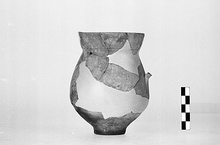 | Description: | Mended from many fragments. Restored in plaster. Flat base. Low-bellied with bulging rim, defined by a groove. Lower end of a thin handle preserved on belly. Fine, brownish ware, light brown on surface. Bottom burnt (blackened). 2nd. c. A.D. type. | |