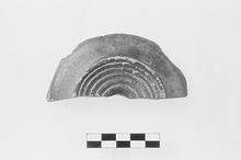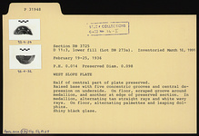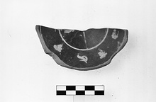 | Description: | Half of central part of plate preserved. Raised base with five concentric grooves and central depression on underside. On floor, scraped groove around medallion, and another at edge of preserved section. In medallion, alternating tan straight rays and white wavy rays. On floor, alternating palmettes and leaping dolphins. Shiny black glaze. | |
