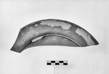 Description:   About one-fourth of rim preserved. Plate with offset rim. Upper surface of rim has convex-concave curve.