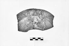 | Description: | Segment preserving ca. one-fourth of plate from rim to just above foot. Offset rim with concave upper surface. Soft, very micaceous clay, light gray (10YR 7/1). Shiny gray glaze, peeling body (7.5YR 5/?). | |
