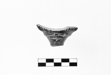 | Description: | Base of cup and upper part of stem preserved. Thin, hollow stem flaring to offset at junction with body; moldmade body, possibly of jewelled long-petal design. Soft, very micaceous light gray clay (10YR 7/1). Shiny, dark gray glaze (7.5YR 4/ ). | |