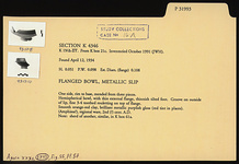 | Description: | One side, rim to base, mended from three pieces. Hemispherical, flanged bowl, with thin external flange, thinnish tilted foot. Groove on outside of lip, fine 3-4 toothed rouletting on top of flange. Smooth orange-red clay, brilliant metallic purplish gloss (red tint in places). (Amphissa?), regional ware, 2nd (?) cent. A.D. Note: fragment of another, similar, in K box 61a. | |