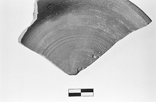 | Description: | One side of flat-based dish with curved sloping wall and narrow flat-topped rim. Band of rouletting on floor; end of a stamp visible at center. Orange-brown clay and slip. Type a variant of P 20222. | |