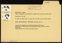 | Description: | Two rim to base fragments (1+2 sherds) giving almost half of vessel. Shallow floor, vertical rounded rim; small angular foot ring, grooved on bottom. Undecorated. Yellow clay; thin 'worn' red slip, with darker splashes. Eastern Sigillata A. | |
