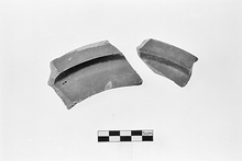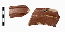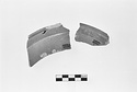 Description:   Two non-joining rim sherds. Flat floor, flat-topped rim, stepped up (low oblique wall on outside).