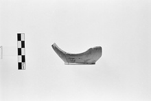 | Description: | Whole of base (two joining fragments). Lower part conical; flat base with small moulding, marked off by a groove on bottom. Gouged decoration on belly: remains of 2 sets of 3 oblique grooves. Thin smooth gray ware, glossy dark gray wash. Knidos (or Rimini?) ware. | |