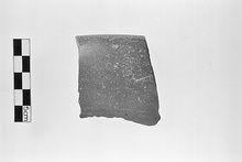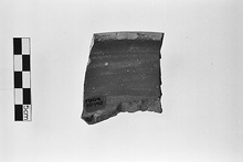 | Description: | Single rim-wall sherd. Rounded wall with incurved lip. Deep pinkish-red ware and slip. 'Cypriot Sigillata'. | |