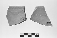 | Description: | Two non-joining fragments from rim and wall. Convex sloping wall with plain rim, slightly flattened on inside; edge of a flat(?) base. Gloss firm on inside, worn on outside. Unclassified (late?) shape. See P 27495-P 27497. Eastern Sigillata B2 ware. | |