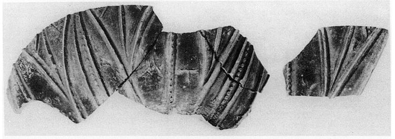 | Description: | Two fragments, one mended from two pieces. Decoration of great leaves, outlined by sharp ridges; rows of dots between. On the larger fragment: ο Α Τ On the smaller: Y Black glaze inside and out. | |