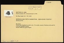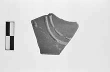 | Description: | Rim fragment. Vertical wall, chamfered on inside at lip. On outside, remains of barbotine leaf-scroll (?): two arcs and a knobbed terminal. Smooth reddish clay, good red gloss. Red gloss 'Pontic' Sigillata. | |