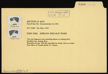 Brownish-red clay. Red slip, burnished on inside, thin on outside.