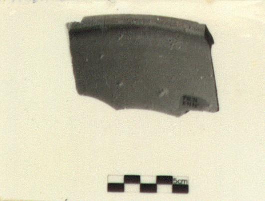 | Description: | Rim/wall fragment. Tilted overhanging rim (flat on outside), sloping floor. A line of shallow rouletting on outside of rim. Reddish ware and slip with lime (causing spalling) and trace of mica. Trace of yellow color on outside. Slip very thin and worn on outside. Perhaps Grynnion ware? Phocean red slip ware. | |