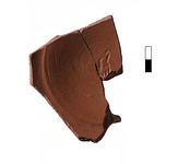 Description:   Two joining fragments: part of base. Low foot with small moulding, shallow floor, offset at edge. At center, within a groove, crude running animal stamp, to left.