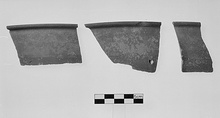 | Description: | Three non-joining rim fragments. Steep wall, narrow flat-topped rim. Orange-red ware and thin wash (redder on exterior). Line-polishing on interior. Minor spalling all over. Phocean red slip ware variant. | |