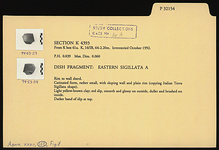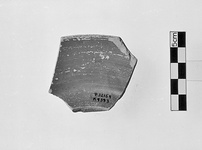 | Description: | Rim to wall fragment. Carinated form, rather small, with sloping wall and plain rim (copying Italian Terra Sigillata shape). Light yellow-brown clay; red slip, smooth and glossy on outside, duller and brushed on inside. Darker band of slip at top. Eastern Sigillata A. | |